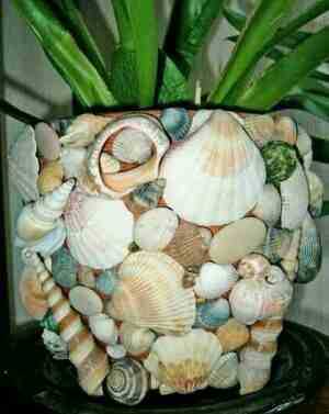 Даже самые неказистые цветочные горшки обретут вторую жизнь после декорирования ракушками.