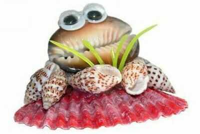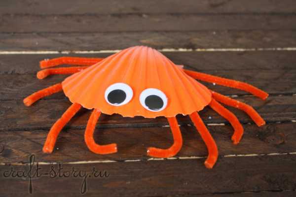 Возьмите плоскую ракушку и ветвленную. Покрасьте их красной краской. Также нужны красные толстые шерстяные нити для лапок. С помощью клея приделываем по три нити с обеих сторон к основанию ракушки. Также спереди две для щупалец. К передним приклеиваем ветвленные раковины. Не забываем про глаза. Их можно сделать самим или уже приклеить готовые.