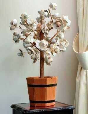 Для его изготовления вам понадобятся форма в виде конуса из картона или пластика, специальный пистолет с клеем, ракушки. Намажьте форму клеем и начинайте их приклеивать. Сначала большие, потом поменьше. Щели, которые остаются можно засыпать светлым песком, так будет красивее. то же самое можно сделать с шаром. Затем крепим его на веточку и вставляем в также декорированный горшок.