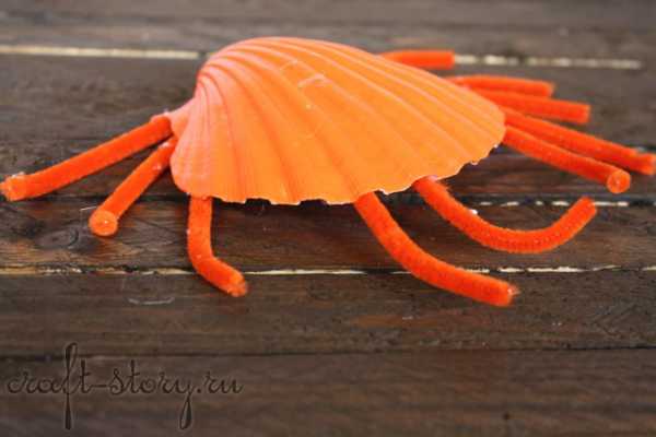 Приклеим на внутреннюю поверхность ракушки ноги из синельной проволоки. И не забудем клешни! Ног у краба 4 пары, обычно 2 пары направлены вперед и 2 — назад. Синельную проволоку можно купить в магазинах товаров для рукоделия или детских супермаркетах. Там же найдем глазки.