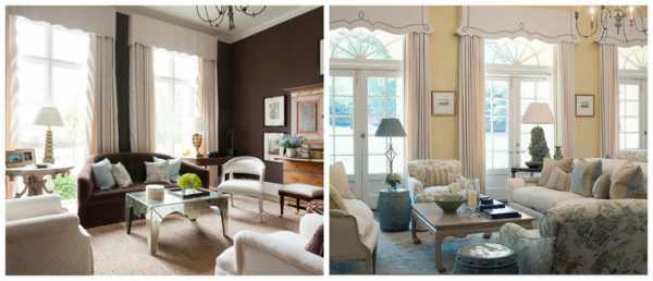 Для гостиных любого стиля уместны сочетания тяжелых бархатных ламбрекенов и воздушного тюля в пол. Так же часто встречаются комбинации мягких складчатых моделей и органзы, фиксированных к декоративной штанге.