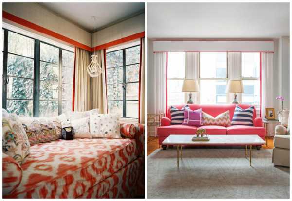 Розовый цвет оконного элемента зала может быть глубоким, ярким или нежным. Цветочный рисунок отлично смотрится в гостиной, оформленной в розовых тонах.