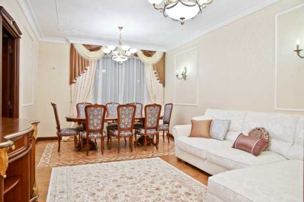 Классический стиль не боится влияния моды, благодаря чему никогда не теряет актуальности. Декоративный элемент для окон в классическом стиле симметричен, выполнен в сочетании тяжелых и легких тканей и не перегружен деталями. Цвет — светлый, кремовый или пастельный. Такие оттенки особенно гармонируют с деревянной мебелью и натуральными полами в гостиной.