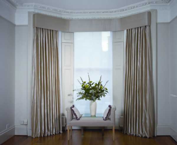 Такой тип драпировки используется в середине оконного проема. Его вертикальные складки образуют острый угол.