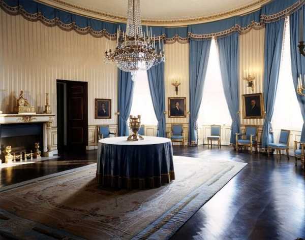 На фото классическая гостиная с ламбрекеном и текстилем синего цвета.