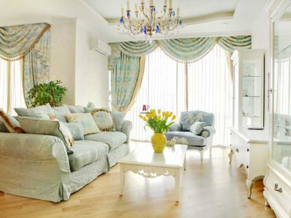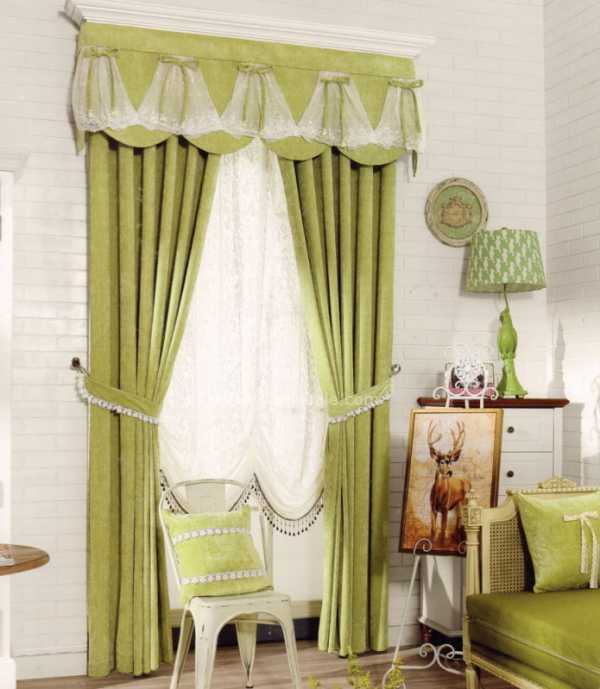 Добавить свежести в интерьер гостиной поможет зеленый ламбрекен. А пастельные, приглушенные цвета традиционно используются в стиле кантри или Прованс.