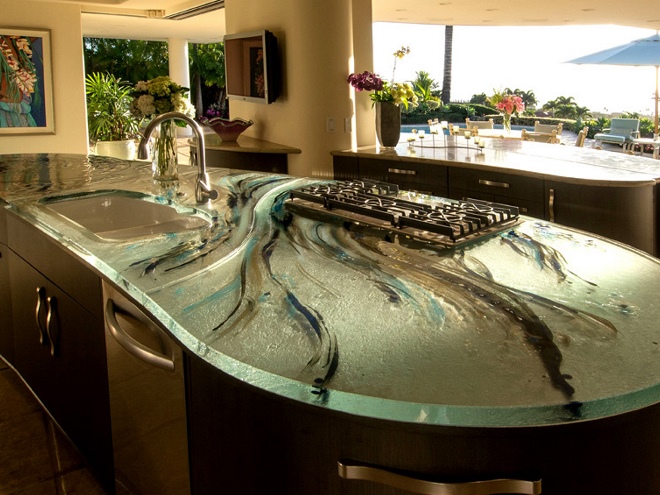 Это еще одно кухонное новшество. Закаленное стекло используется для обустройства кузни, благодаря чему поверхность очень прочная и не разбивается. Также применяется клейкое стекло, в которой две панели разделены несколькими слоями фольги, обеспечивая высокую безопасность материала. Даже сломанная столешница не повредит потенциальному пользователю. Толщина и длина стеклянного верха имеет очень широкий спектр, а в случае закаленного стекла толщина начинается примерно от 10 мм.
