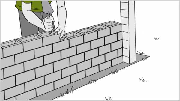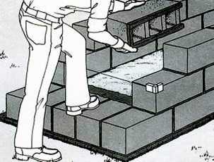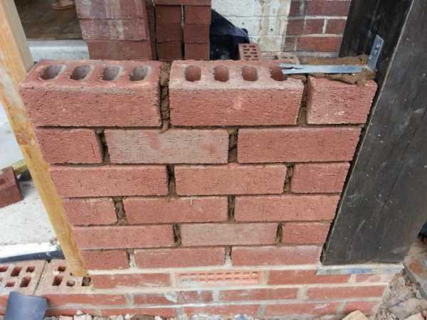 Далее, второй слой укладывается с перевязкой шва между кирпичами или блоками первого ряда приблизительно на 1/3, постоянно проверяйте вертикальность кладки.