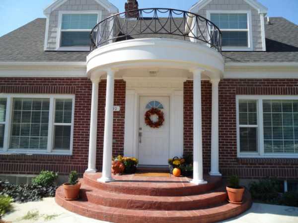 1. Цветовые контрасты. Лучше всего для этого выбрать белый цвет, особенно если дом выполнен из красного кирпича. Яркий контраст придаёт дому дополнительную привлекательность, а продуманное расположение белых вставок позволяет подчеркнуть пропорции или архитектурные элементы. Если дом небольшой, крыльцо достаточно дополнить белыми перилами или ограждениями. Если речь идёт о большом особняке – подойдут белые колонны. Впрочем, цвет может быть любым. Чаще всего окрашивают в яркий цвет входную дверь и опорные столбики крылечка, подчёркивая гостеприимство хозяина;
