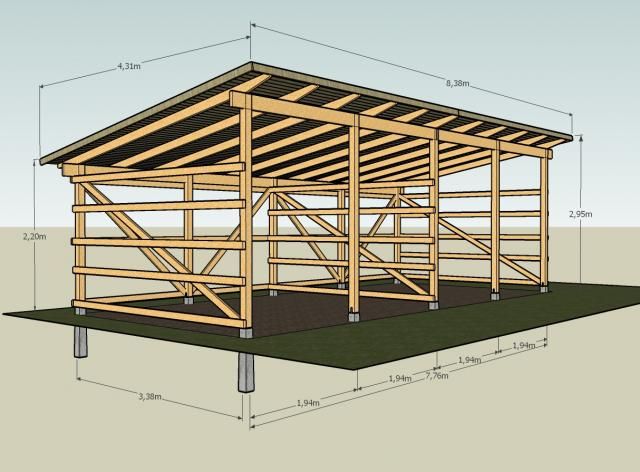 Высота стоек равна высоте сарая. Стандартные размеры 2,5-3 м.