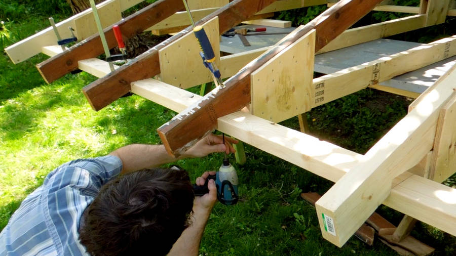 - Шаблоны сделаны остальными рафиледами. Сделайте разметку на стенах сарая и закрепите стропильные ноги. При возведении легких построек достаточно использовать гвозди или саморезы.