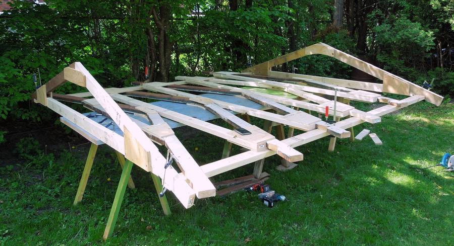 Готовые стропильные фермы двухскатной крыши представляет собой правильные треугольники, если вы строите симметричную крышу, и разносторонние, если асимметричную или несимметричную. Но, если в вашем сарае будет внутренняя стена, вам лучше построить двускатную крышу по системе наслонных стропил, которые дополнительно опираются на такую перегородку.