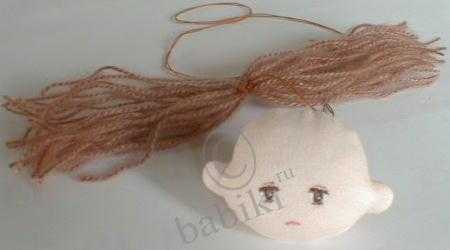 Куколка одета, теперь можно приступить к ее волосам. В данном мастер-классе использовалась шерсть для валяния. Она приваливалась от макушки головы по центру, таким образом формировался пробор. Вместо шерсти можно пришить трессы из синтетических волос, сделать их из ниток или атласной ленты.