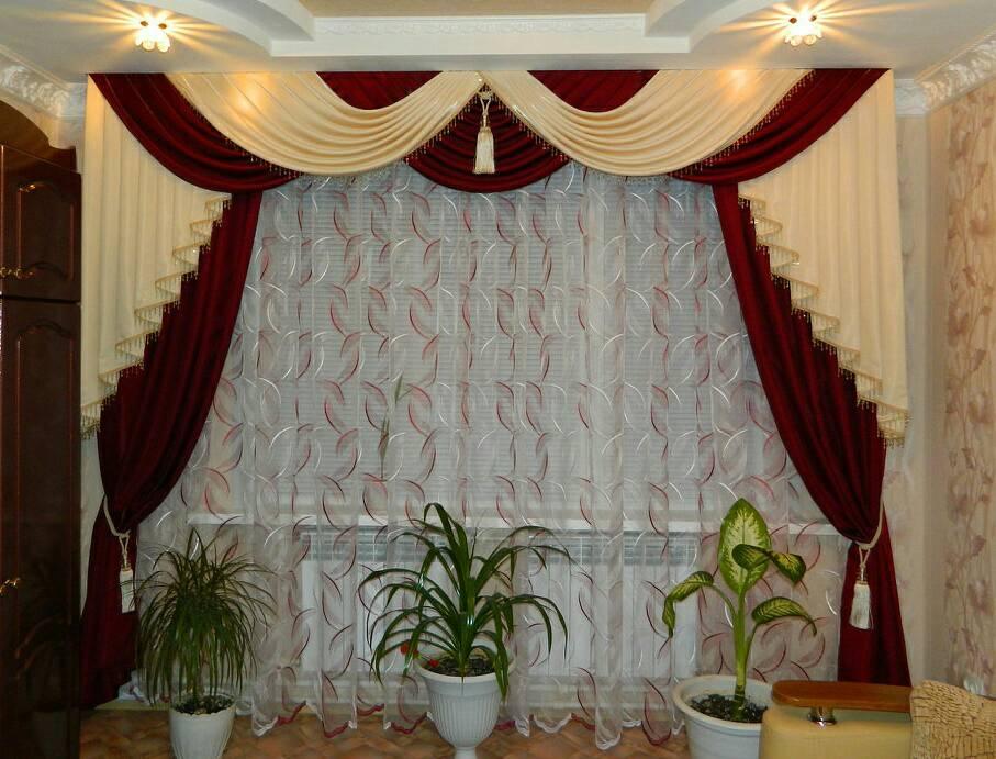 При этом верхняя драпировка может быть выполнена как в едином с тюлем и шторами стиле, так и быть совершенно самостоятельным элементом.