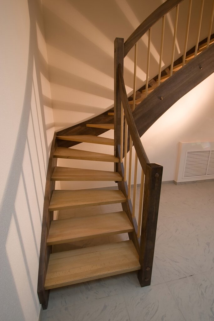 Легко перемещаться, изгиб обычно пологий, что делает его элегантным выбором для любого стиля дома. Этот тип лестницы считается наиболее сложным в строительстве и, следовательно, одним из самых дорогих.