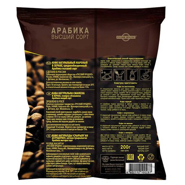 Продукт реализуется исключительно в зернах, расфасованных в мягкие упаковки по 250 или 1000 г.