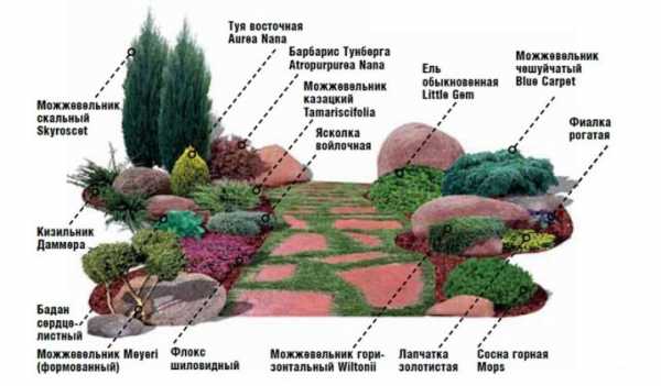 Классический альпинарий предполагает обязательное наличие нескольких некрупных вечнозеленых деревьев — сосны, ели, пихты, туи, можжевельника, которые составляют основу растительной композиции.