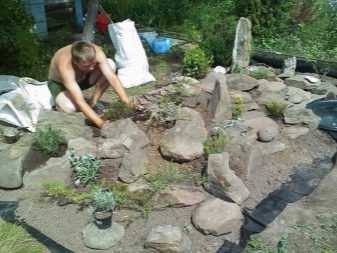 Камни выкладывают по принципу горки, для первого опыта лучше выбрать по возможности пологие конструкции. Для горок высота которых превышает 1 метр, нужно осуществить специальную кладку.