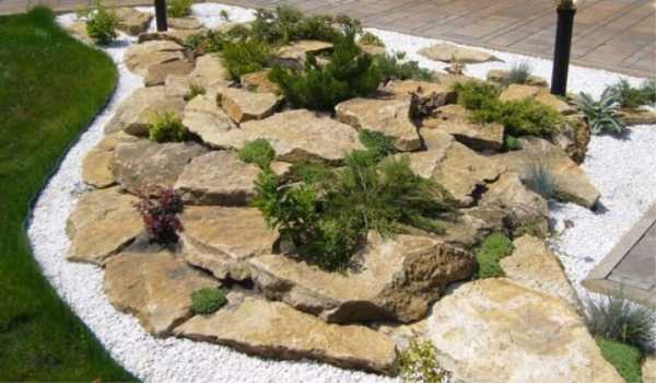 При закладке рокария, помимо горных пород камня, используют речные валуны и гальку.