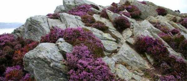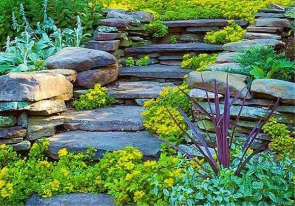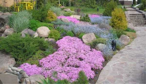 - — отличный вариант для создания альпийской горки своими руками на ровном участке, предполагает использование небольших камней в сочетании с цветущими растениями.