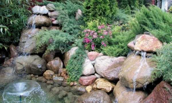 Мощность насоса для водопада должна составлять 70 Вт. Он крепится на специальной подставке, чтобы не касаться дна, и хорошенько маскируется камнями. Прибор должен пройти проверку безопасности подключения. К этому моменту альпинарий должен быть выложен до границы, с которой начинает течь вода. Сюда подводят шланг и маскируют камнями.