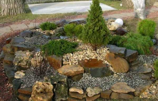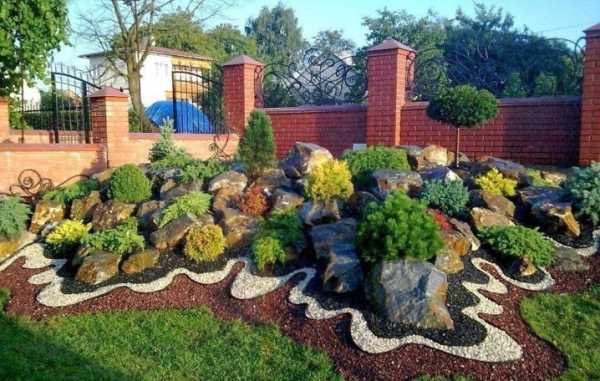 Альпийская горка с хвойными породами кустарников и декоративной насыпью из разноцветного гравия.