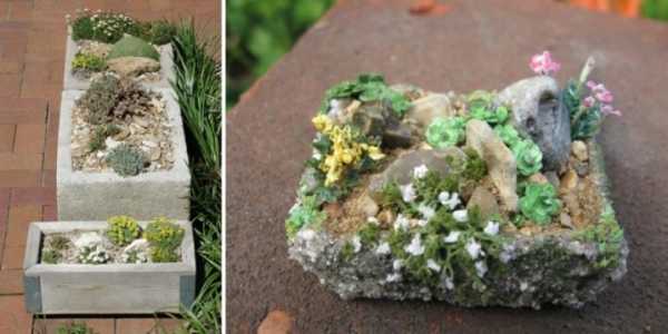 Интересным аналогом обычного рокария будет его уменьшенная копия: сад камней в миниатюре, засаженный небольшими растениями. Главное качество такой композиции – это мобильность. Этот сад можно разбить в пластиковом контейнере, тазике или керамической посуде. Следовательно, его легко перенести в любое удобное место. При наступлении холодов мини-рокарий можно транспортировать в теплицу или сарай, поэтому такой вариант подойдет для растений, которые любят тепло.