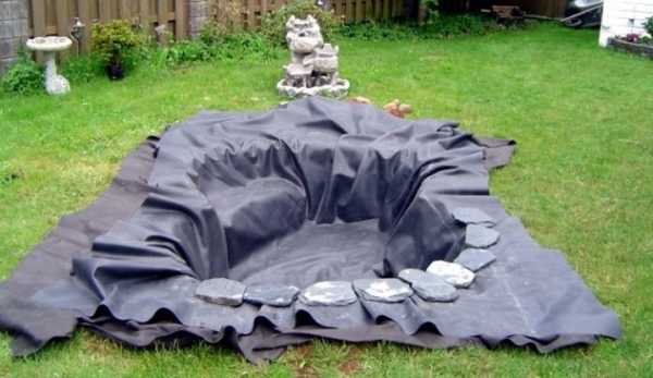 Стенки чаши рекомендуется делать с небольшим уклоном – так будет легче разместить на них камни. Дно устилается песком слоем в 100 мм и хорошо трамбуется. Сверху на песок стелют геотекстиль, а на него водоизолирующую пленку из каучука. Такая пленка с легкостью прослужит несколько десятков лет. Необходимо оставить свободные края за границей ямы, позже они зароются в землю.