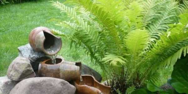 Вариант использования керамических изделий для маскировки трубы, подающей воду. Папоротник, как влаголюбивое растение, радует хозяев сочной зеленью.