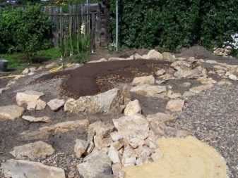 Этот слой тоже нужно залить водой и хорошенько утрамбовать. Грунт, который образовался при рытье чаши, нужно очистить от корешков, мусора и камней и засыпать поверх дренажа. Необходимо дать 2-3 недели грунту для усадки, а после приступить к укладке камней. Многие предпочитают начинать строительство горки осенью, чтобы грунт за зиму хорошенько осел.