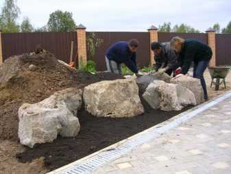 Сначала устанавливают самые крупные камни. Эту работу нужно начинать после хорошей усадки грунта. Камни нужно заглубить в грунт более чем на 50% от их объема. Камушки поменьше должны располагаться таким образом, чтобы быть защищенными от ветров и осадков, иначе они будут подмываться и сползать. Не стоит забывать о том, что между камнями нужно оставлять достаточно открытого места для высадки растений и цветов.