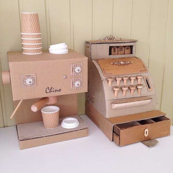 Для игры в магазин из картона можно сделать кассу, кофе-машину и другие агрегаты