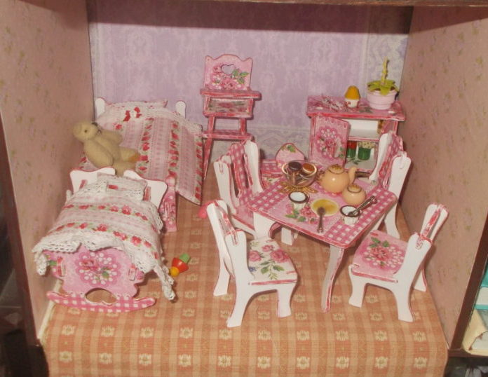 Кукольную мебель для своего домика я мастерила из фанеры и задумала её такой, какой посчитала нужной для своих кукол — мебель получилась большая, поэтому и «мелочёвку» в домик я придумывала и делала сравнительно большого размера.