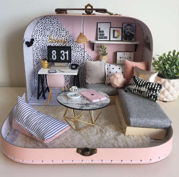 Источник: PinterestКукольный домик-чемодан — это именно то, на что он похож — элементы кукольного домика упакованы в крошечный и симпатичный чемоданчик.Вы можете раскрасить внутреннюю часть чемодана в соответствии с тематикой ваших элементов и настроить внешний вид. Для начала вам не нужно много — всего лишь несколько наклеек для кукольных домиков, несколько деревянных кукол и мебель для кукольных домиков, которые вы можете приобрести в ближайшем магазине поделок.