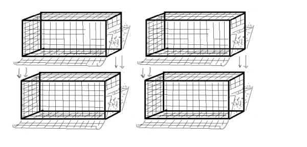 Чертёж каркаса клеткиШаг второй: Если клетку вы разместите ближе к окну, тогда заднюю и боковые стенки клетки делаете из фанеры. Впереди делаем стенку из мелкоячеистой сварной сетки. Дно – двухуровневое. Сначала к каркасу на расстоянии 20 см. от нижней точки конструкции крепим сварную сетку под небольшим уклоном, чтобы яйца могли скатываться в яйцесборник, а затем на низ каркаса крепим поддон из фанеры или плоского шифера. Можно приспособить в качестве материала на поддон и поликарбонат. В процессе жизнедеятельности помет от кур свободно проваливается через сетчатое дно на поддон. Один или два раза в месяц поддон вычищается. В качестве поддона лучше использовать плоский шифер, потому что фанера со временем отслаивается из-за попадания на нее влаги.