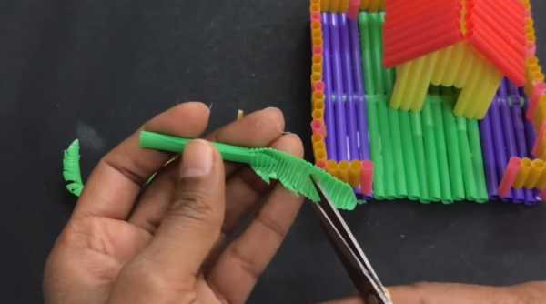 Окрашивать домик не придется, так как трубочки можно подобрать любого цвета. Домик получится яркий и веселый. Из трубочек зеленого цвета можно изобразить деревья, пальмы или цветы на клумбе.