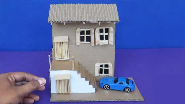 Миниатюрные домики своими руками можно сделать из упаковочного материала, используя коробки от печенья или техники. Чтобы крыша была рифленой, просто снимите верхнюю тонкую бумагу с гофрированного картона. Окошки вырезаны ножом и обклеены деревянными палочками.