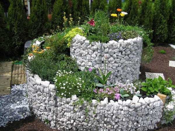 Многие дачники предпочитают обустраивать цветники при помощи габионов, выполненных из строительной сетки, заполненной камнем. Достоинством такой клумбы служит то, что ей можно придать любую форму, поскольку сетка легко поддается деформации.