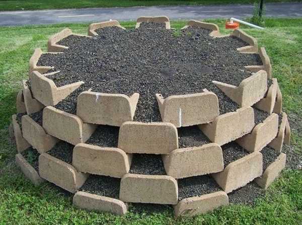 Сначала нужно определиться с формой клумбы, после этого подготовить под конструкцию углубление, в вырытую яму насыпьте слой щебня. Ярусы сооружения выкладываются с помощью блоков, внутрь которых насыпают землю и сажают цветы.