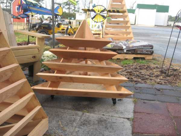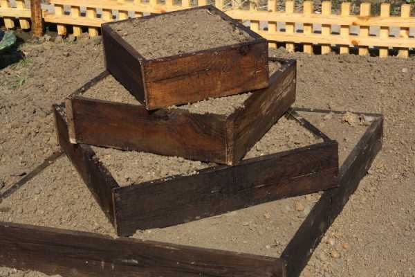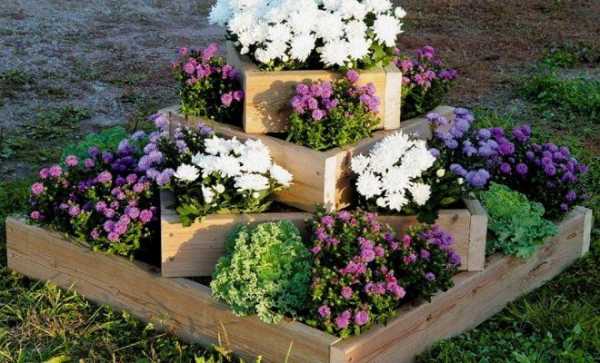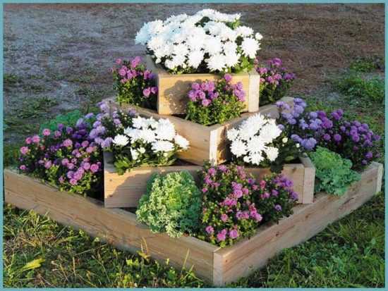 Если вы решили соорудить композицию из дерева, можете воспользоваться новыми досками либо взять ненужные ящики или паллеты. Клумбе можно придать прямоугольную форму либо сделать ее в виде ромба, треугольника. Сам по себе цветник – это своего рода пирамида, которая состоит из нескольких ярусов ящиков, которые устанавливаются друг на друга.