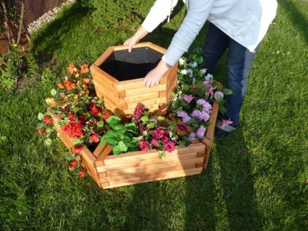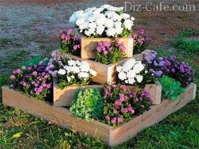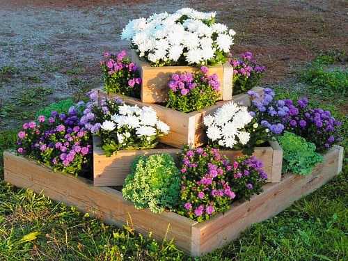 Пример создания ярусной клумбы из дерева. Используется четыре контейнера без дна, расположенные особым образом, в образованных углах высаживаются цветы