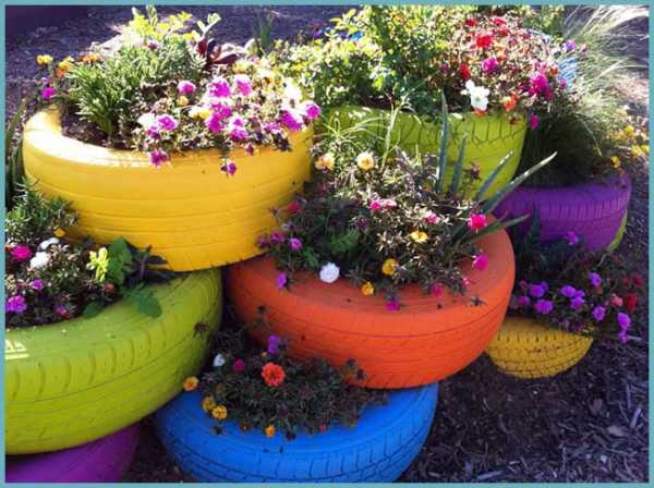 Для создания такой клумбы использованы целые шины, для верхних ярусов внизу нужно сделать поддон. Яркие краски, использованные для окрашивания шин, гармонируют с яркими цветами