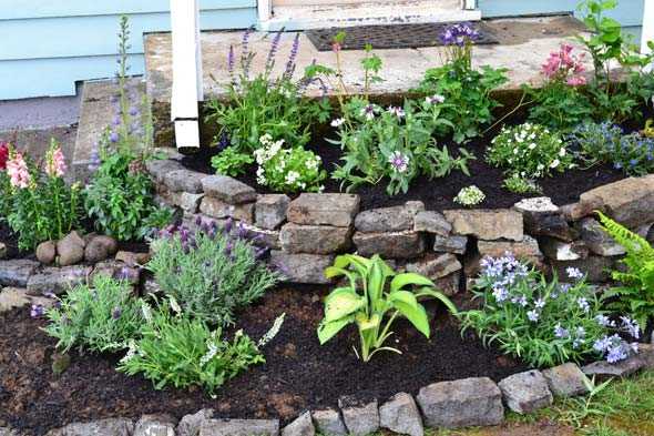 Камень, вне зависимости от размера, можно использовать для строительства клумбы. Сочетание зеленых насаждений с природным материалом уместно для любого ландшафта.
