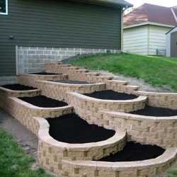 Для создания вертикальной ярусной клумбы используются специальные блоки-лотки, имеющие усеченную сторону. У такой клумбы не будет проблем с оттоком воды с верхних ярусов, нужно только создать хороший дренажный слой внизу