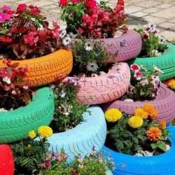 В покрышки насыпьте грунт и посадите цветы для клумбы, если есть желание, то раскрасьте шины, используя лакокрасочные материалы для наружных работ.