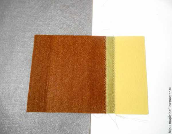7. К правой стороне желтого прямоугольника пришьем ветку, вырезанную из темно- коричневого фетра. Пришивать лучше, используя вид шва под названием «назад иголка». Остальные детали тоже будем пришивать этим швом.