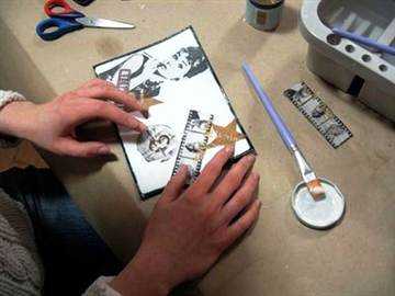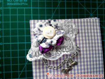 Также можно приклеить красивый рисунок из скрапбумаги и украсить его ажурными ленточками.