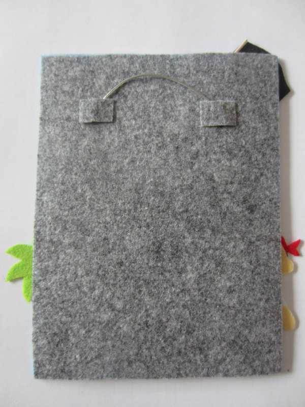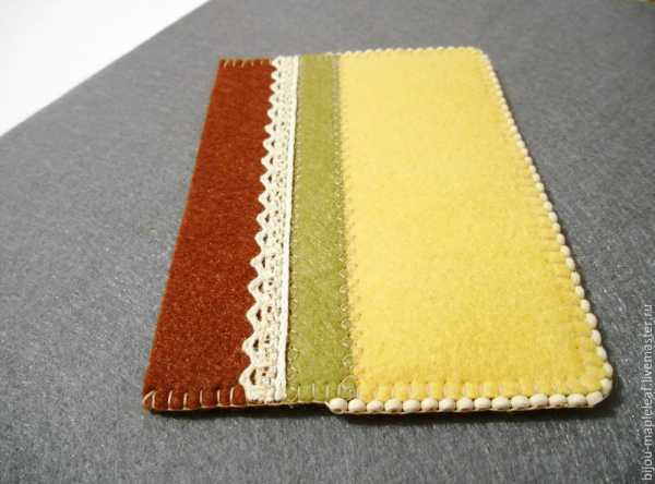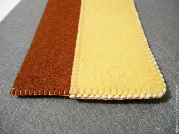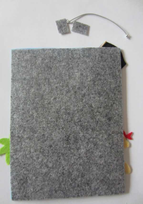 Получившуюся аппликацию накладываем поверх основы из темного фетра, которую мы подготовили в самом начале. Снизу основы, справа, подкладываем один из двух прямоугольников, уголки слегка скругляем и прошиваем по периметру швом «вперед иголка».
