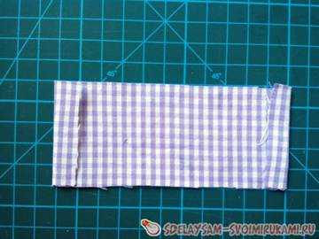 Затем из ткани вырезаем еще один небольшой прямоугольник, размером 13*5 см. Подгибаем по 1 см с краев и хорошенько заутюживаем.