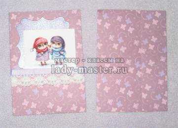 Далее начинаем оформлять верх. Вырезаем из скрапбумагии четырехугольник 8,5х12,2 см, и с двух частей делаем еще четырехугольник аналогичного размера и приклеиваем двусторонней лентой. На цельный четырехугольник приклеиваем рубку, а на нее при помощи скотча фиксируем рисунок с совушками. Теперь вырезаем по 10 см кружева и репсовой ленты и прикладываем снизу картинки. Сворачиваем и с внутренней части фиксируем небольшими отрезками скотча.